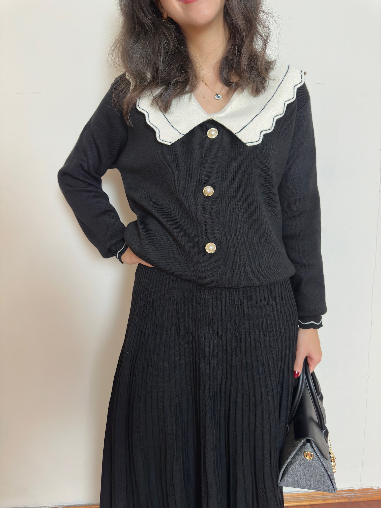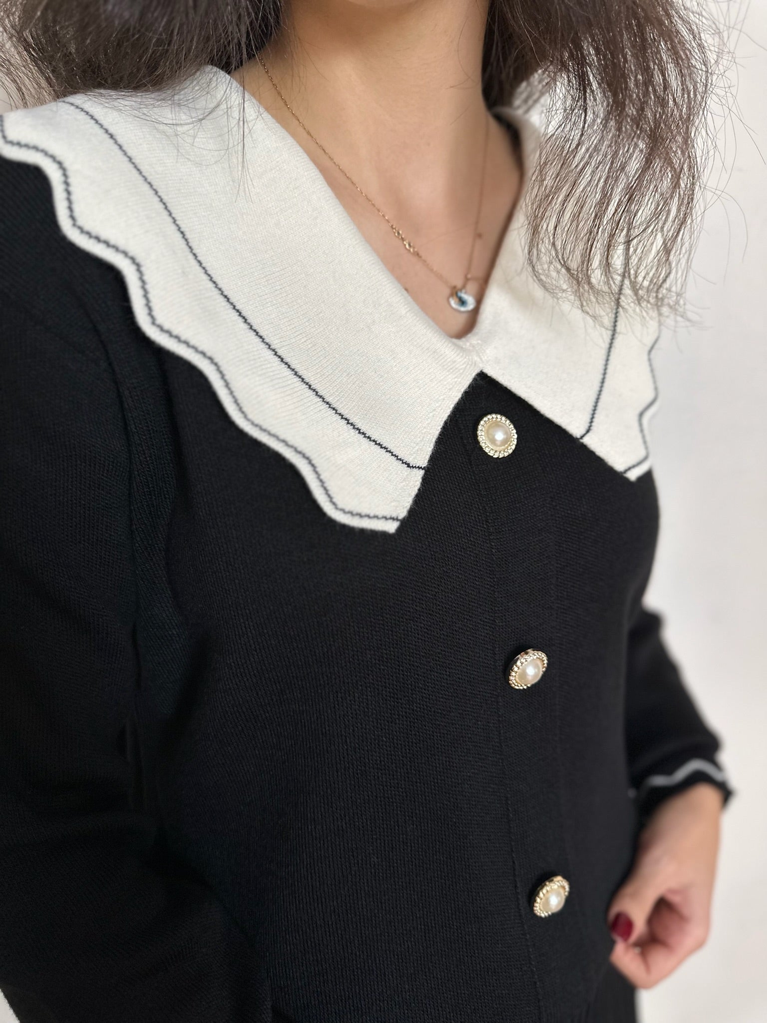 🤍 Kontrast beyaz yakalı kazak, dekoratif inci düğme detaylarıyla zarif bir görünüm katar.