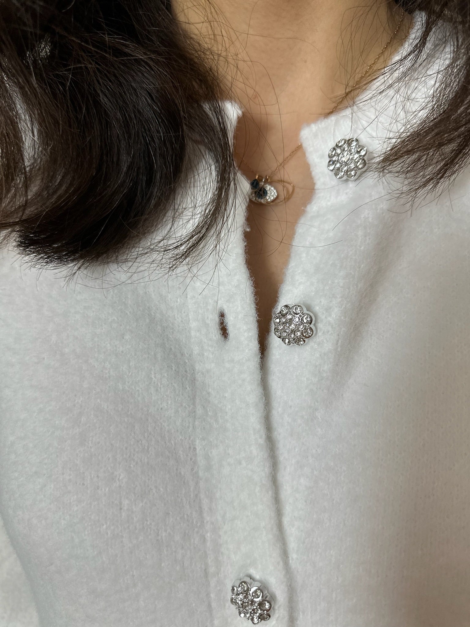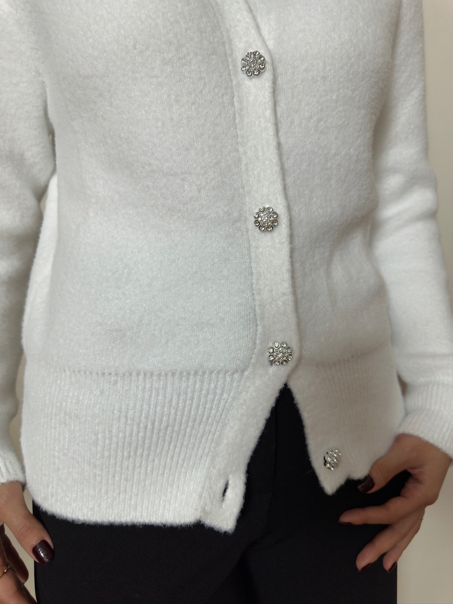 Beyaz Kristal Taş Düğmeli Yumuşak Triko Hırka, sade görünümüne zarif bir ışıltı katan düğme detaylarıyla öne çıkar.