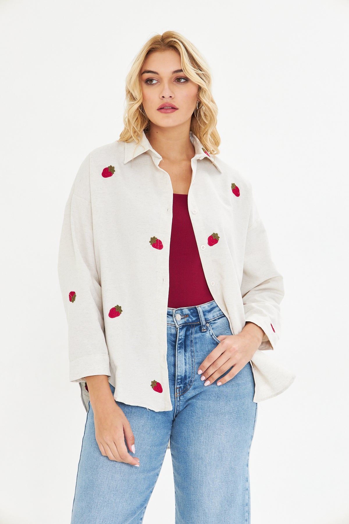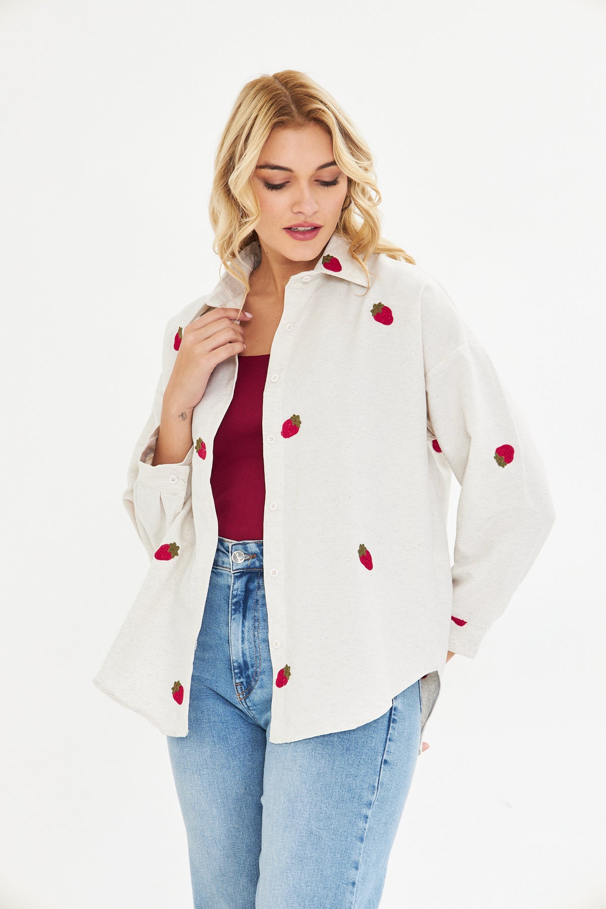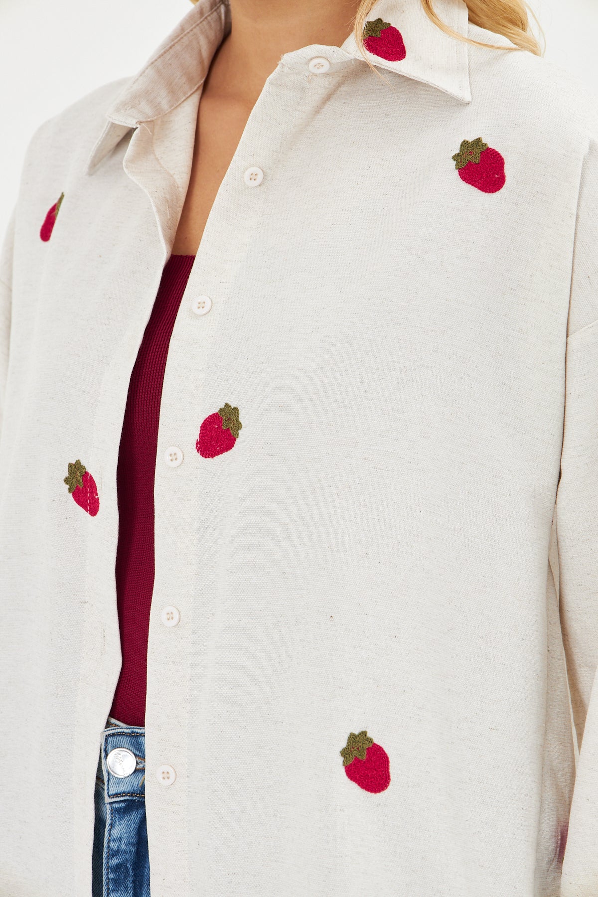 Günlük stilinize zarif bir detay katacak Çilek Süzene Nakışlı Gömlek, kalp motifli süzene nakışı ile özgün ve şık bir görünüm sunar.