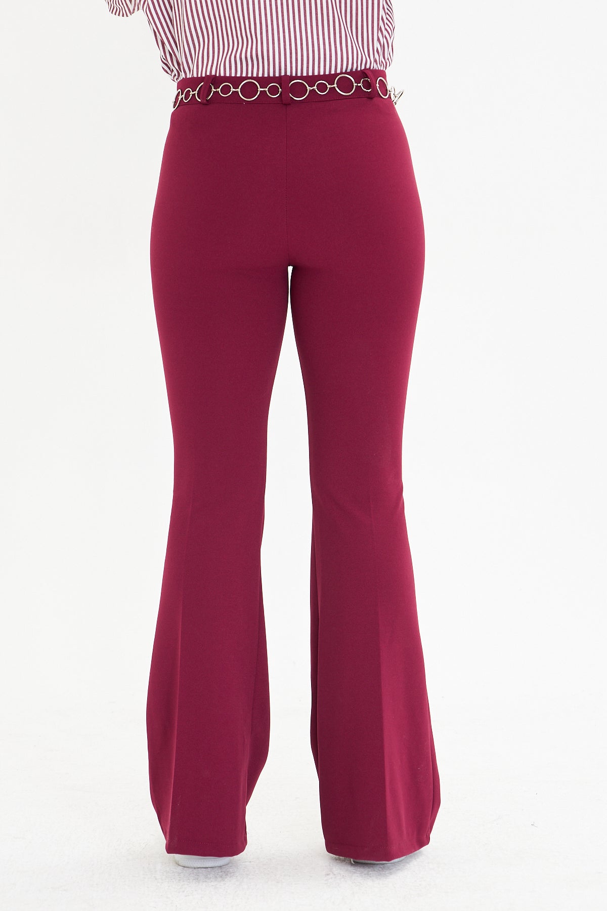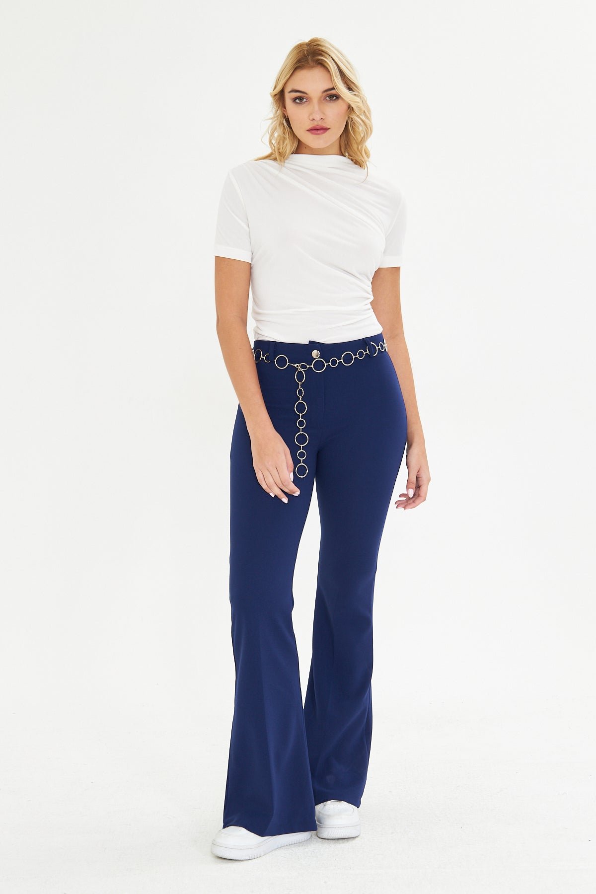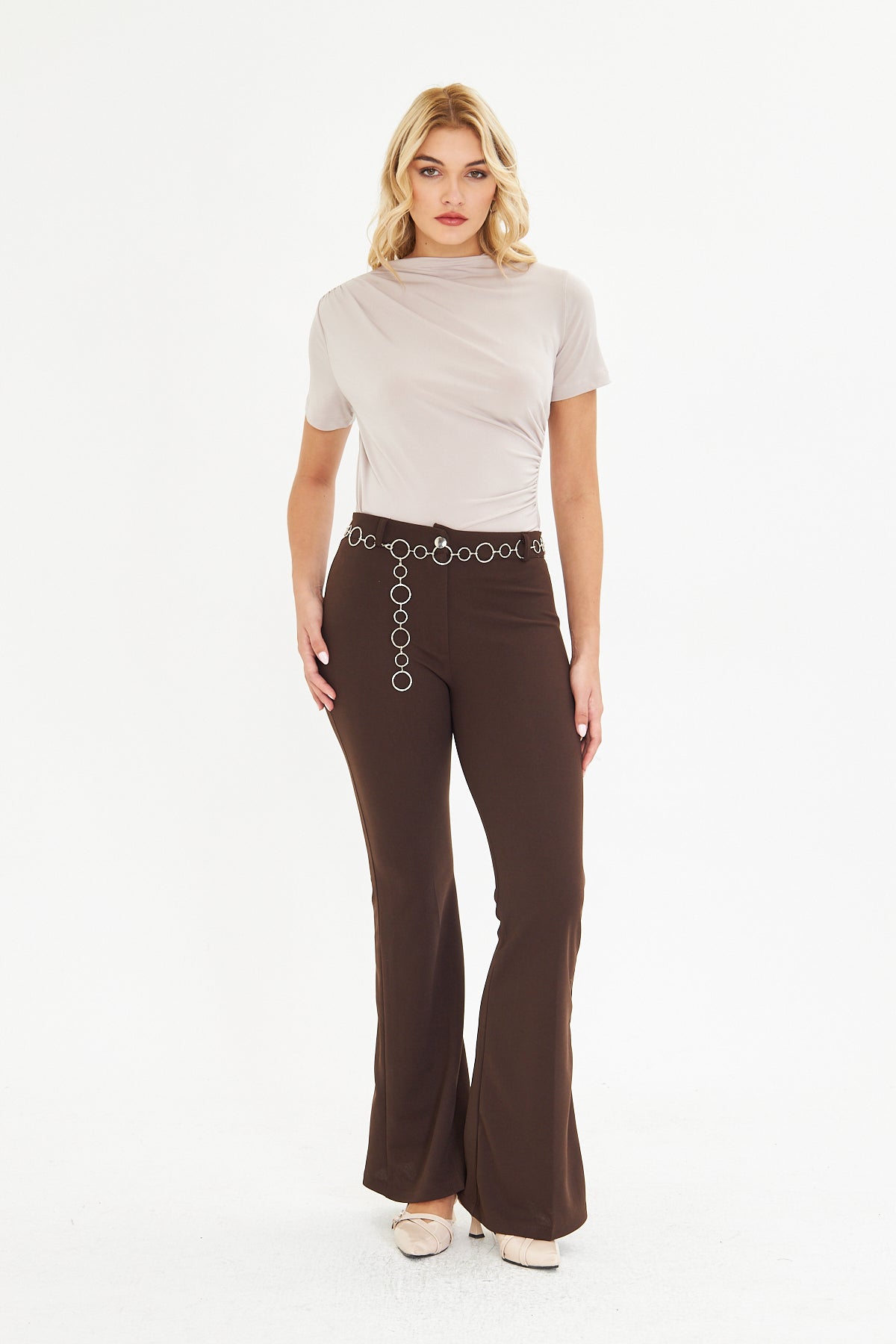 Flare kesimi ve ispanyol paça detayıyla bacak boyunu daha uzun gösterirken, metal halka kemeri şıklığı tamamlayan zarif bir detay olarak öne çıkar.