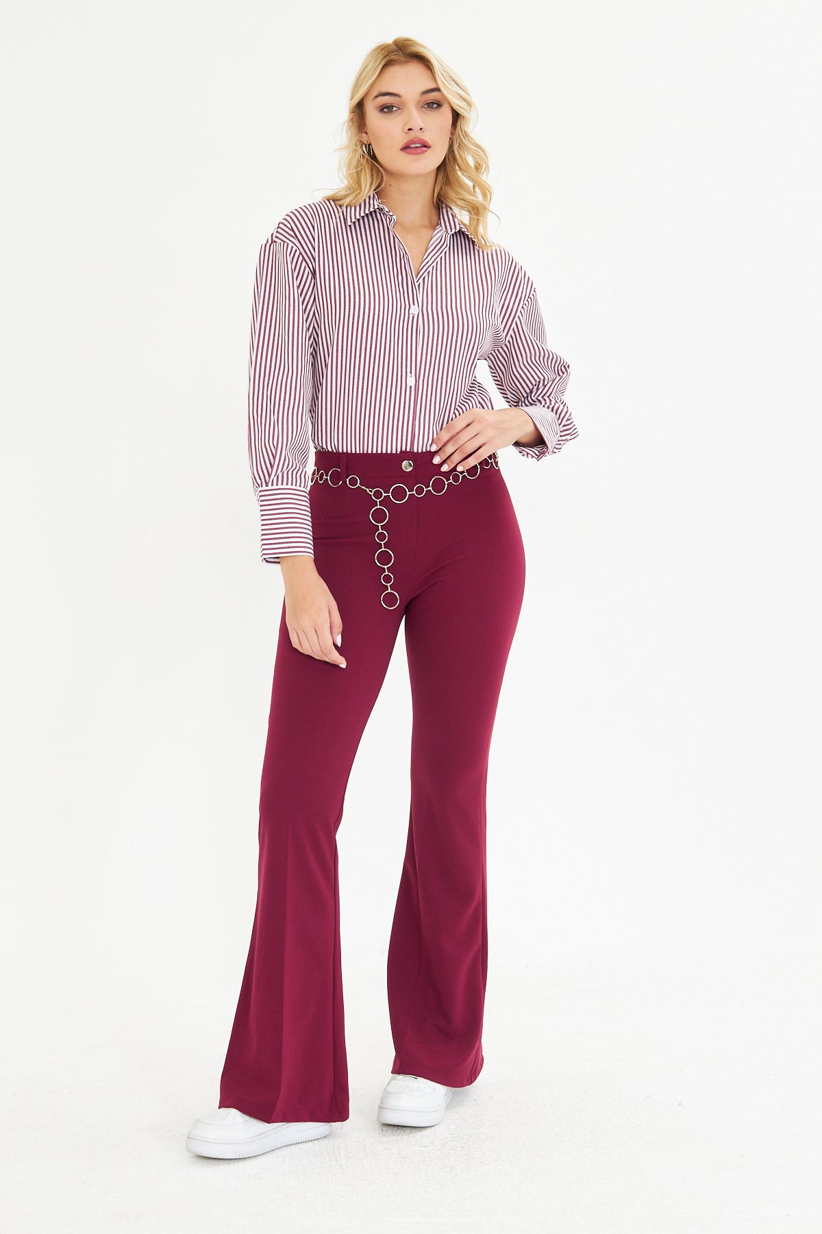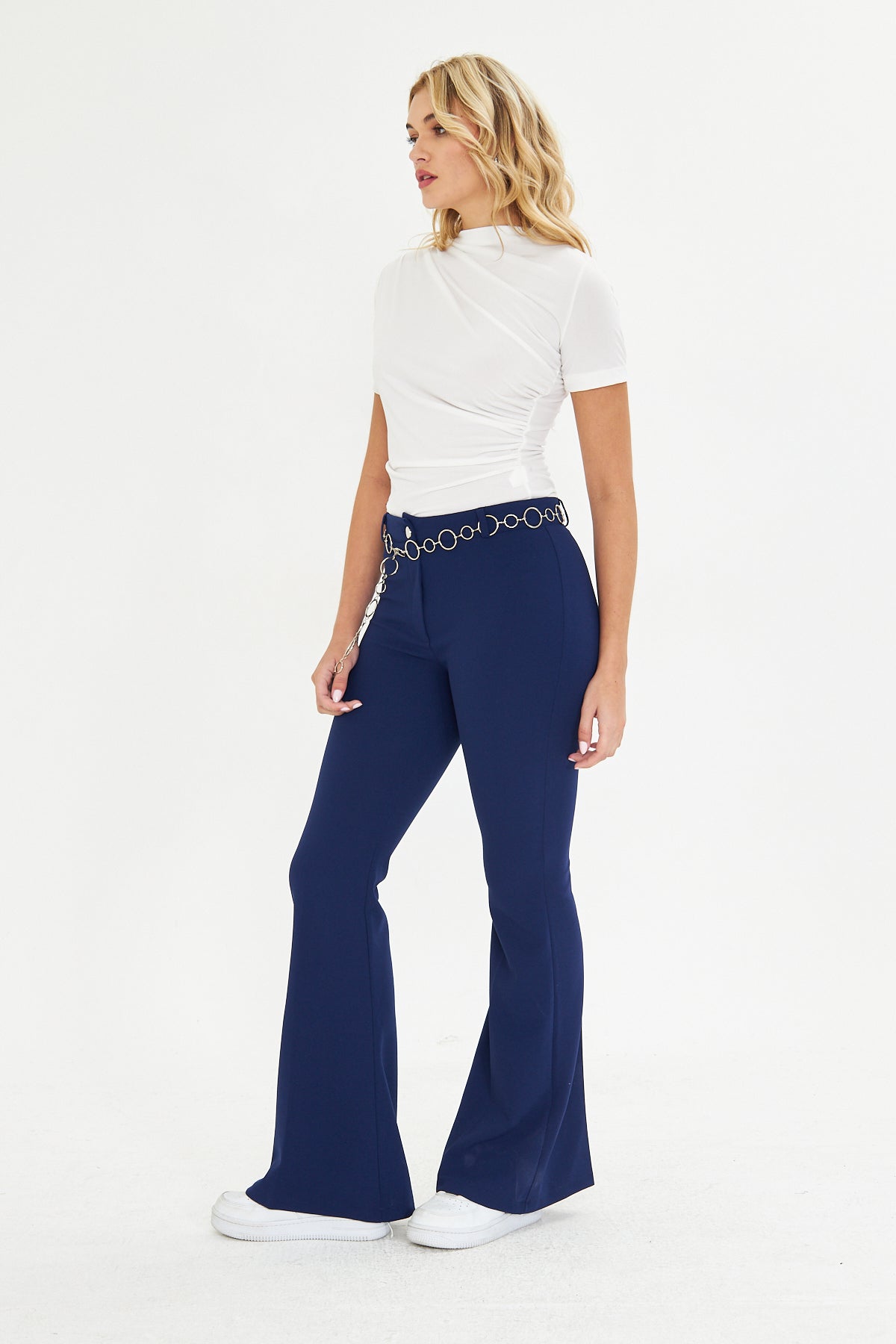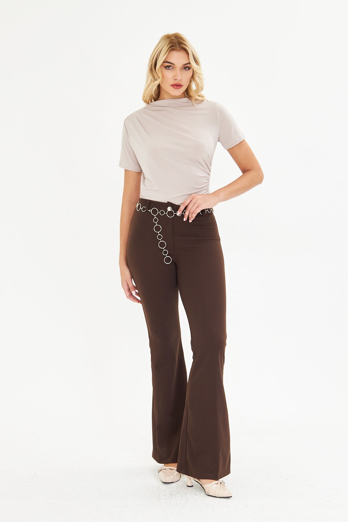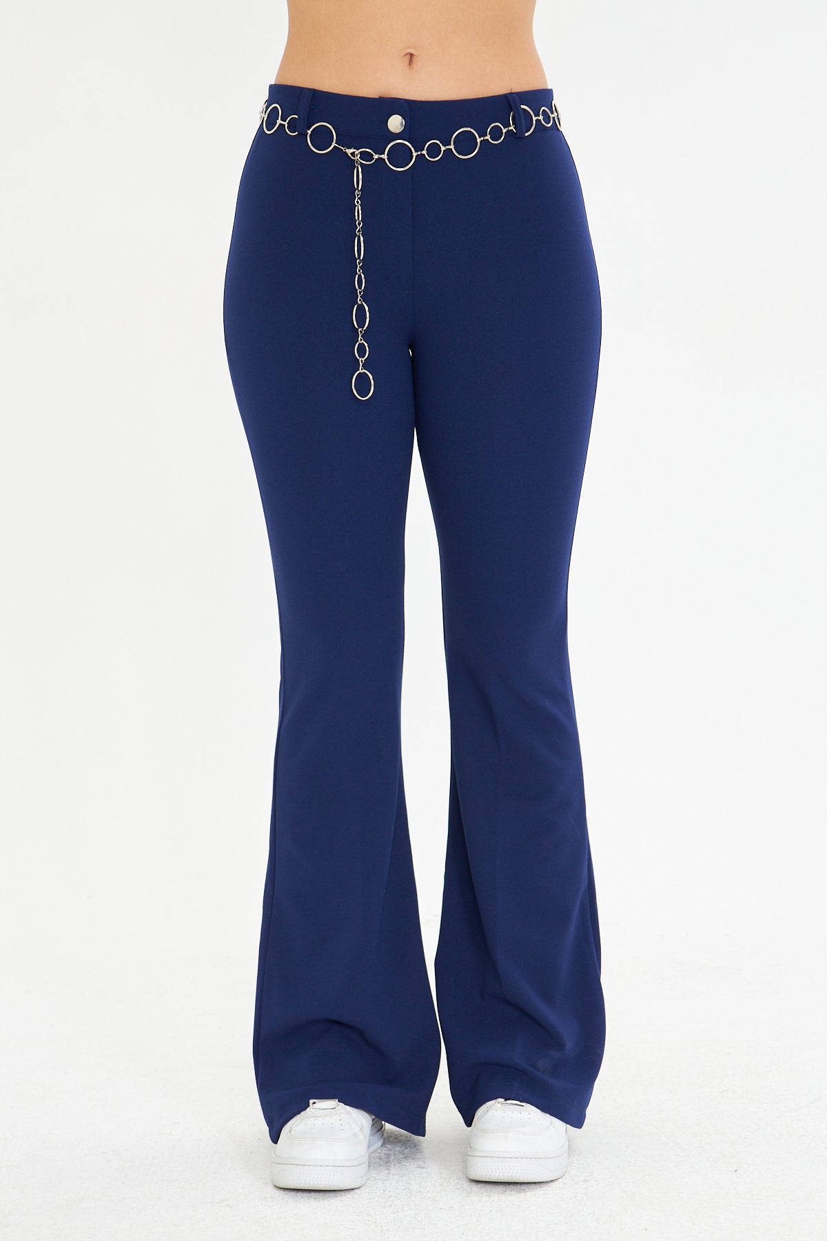 Flare kesimi ve ispanyol paça detayıyla bacak boyunu daha uzun gösterirken, metal halka kemeri şıklığı tamamlayan zarif bir detay olarak öne çıkar.