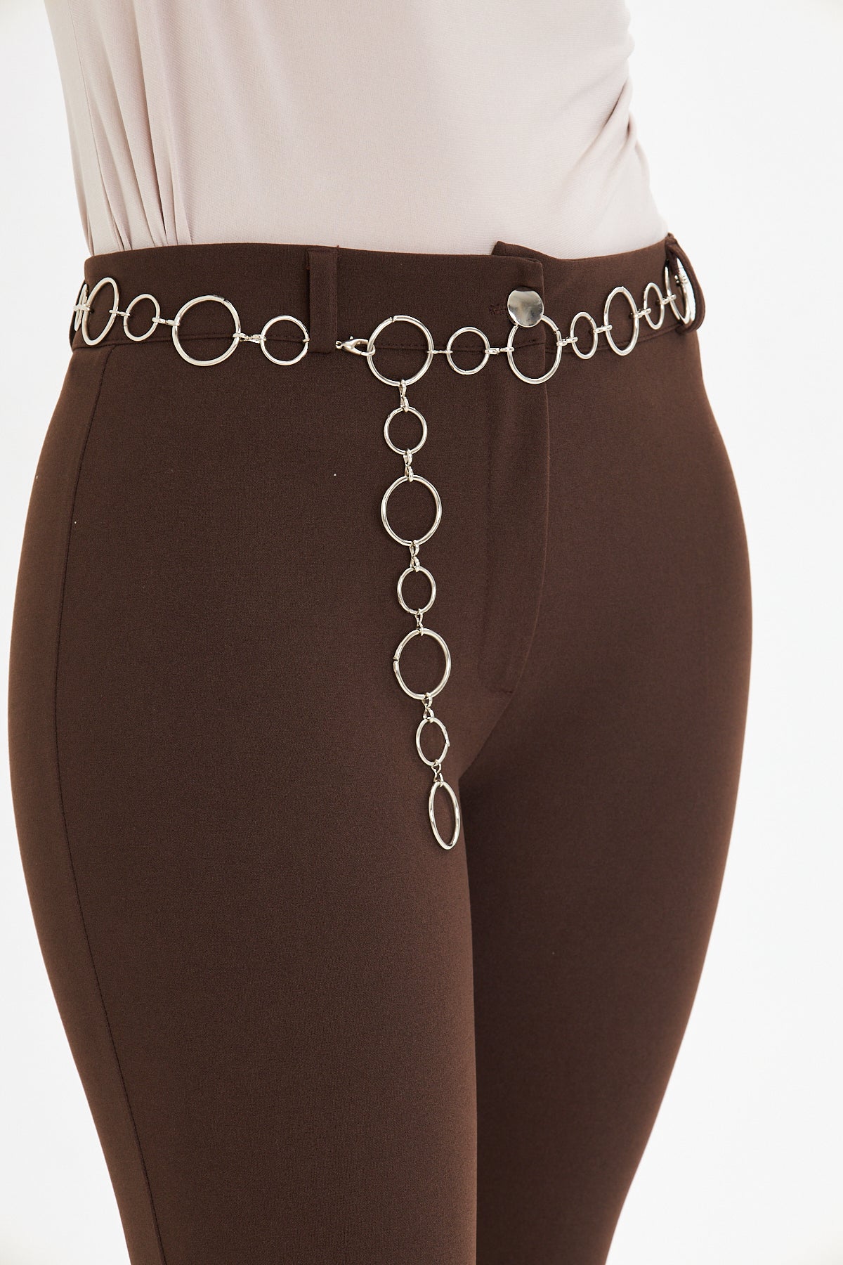 Günlük stilinize zarif bir dokunuş katacak Flare Metal Halka Kemerli Kumaş Pantolon, modern tasarımı ve konforu bir araya getiriyor.