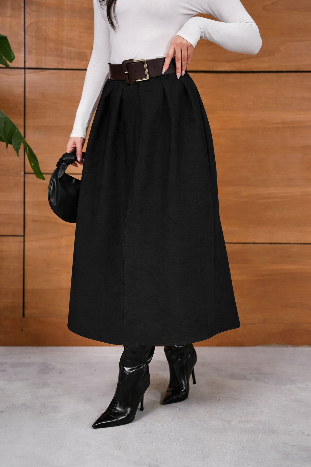 Yüksek bel tasarımı vücut formunu dengeli şekilde ortaya çıkarırken, kemer tokalı bel detayı modern ve stil sahibi bir görünüm sağlar. Ön kısmındaki yırtmaç detayı, eteğe feminen bir hareket katarken yürüyüş esnasında zarif bir akış oluşturur.
