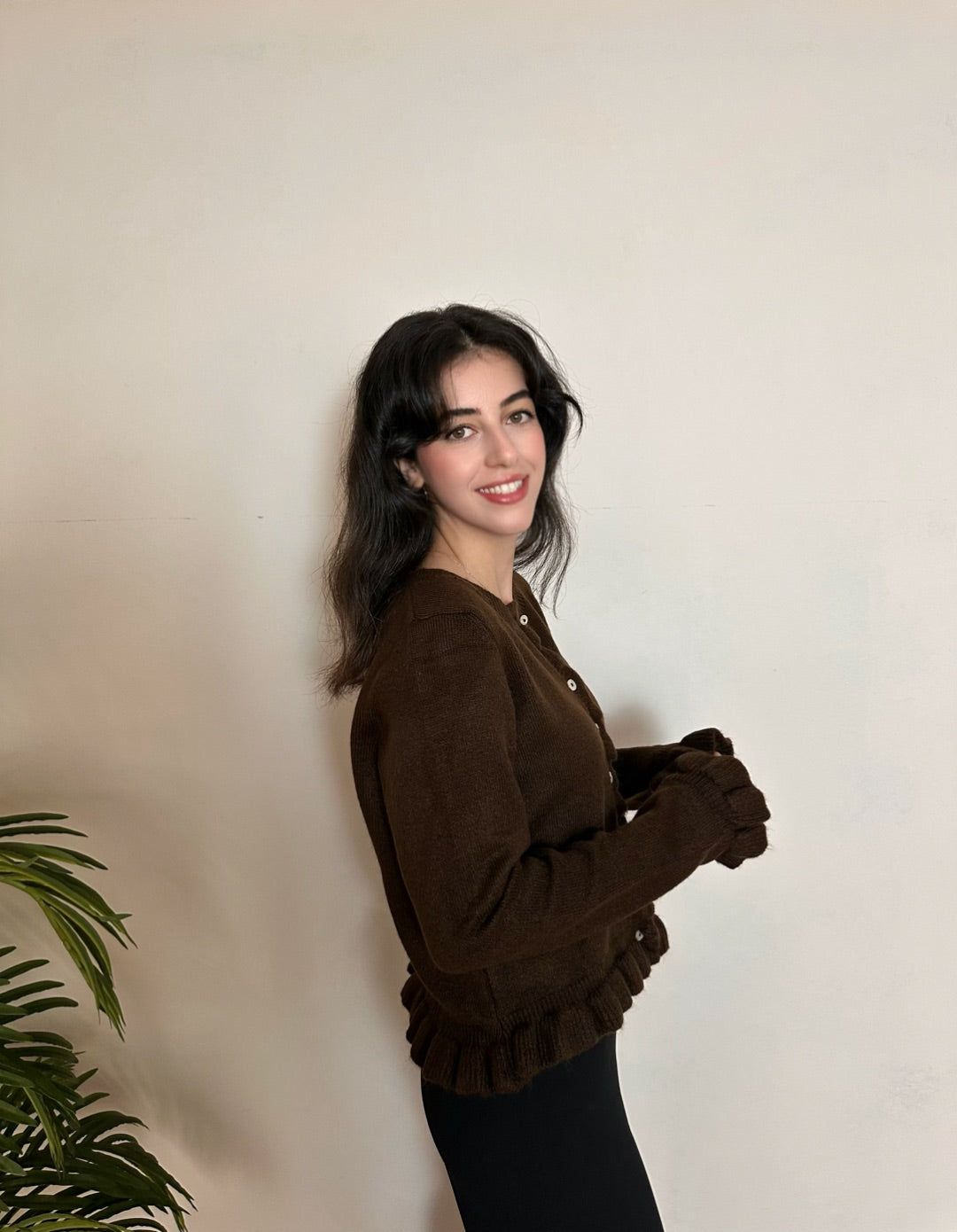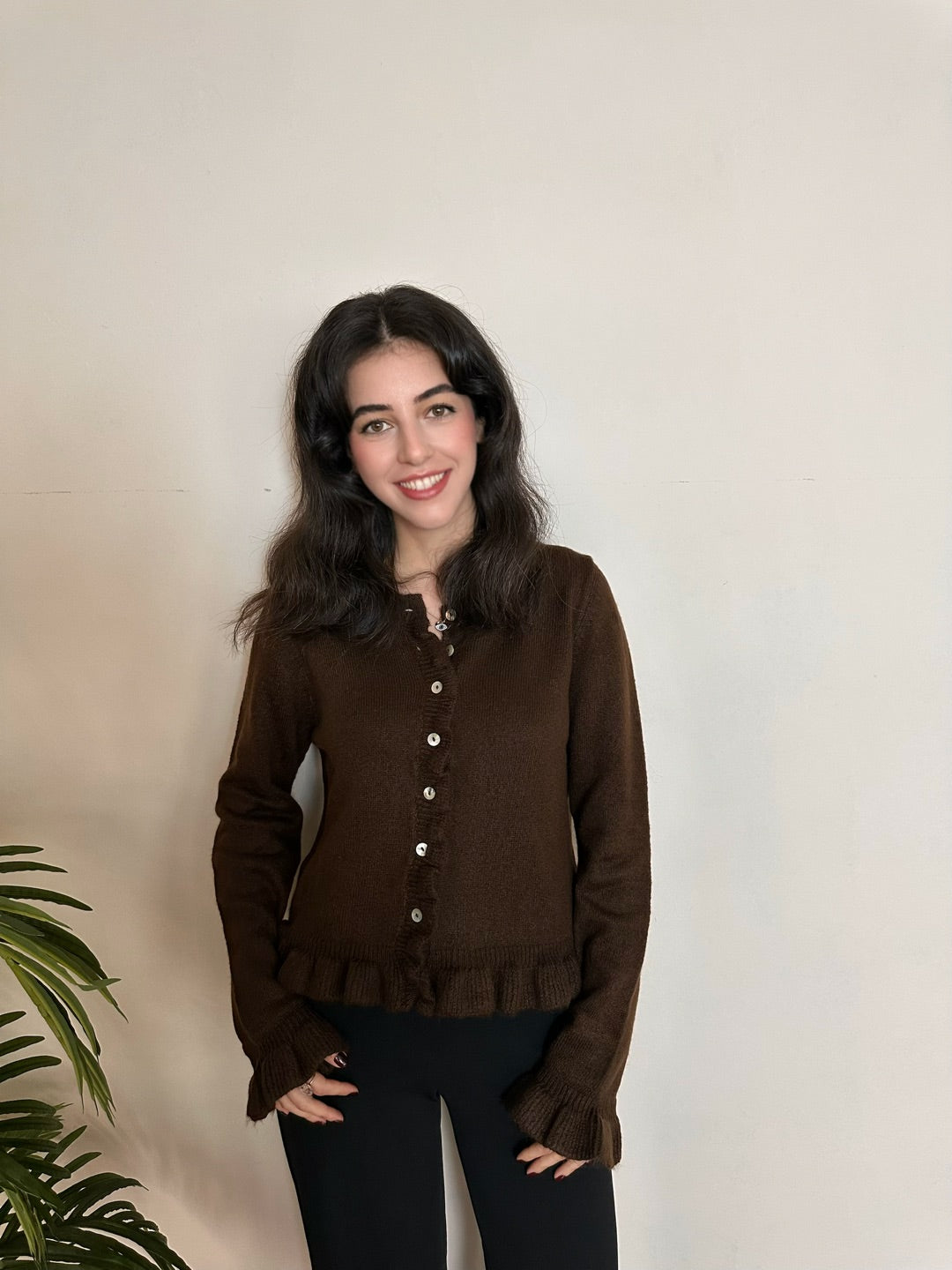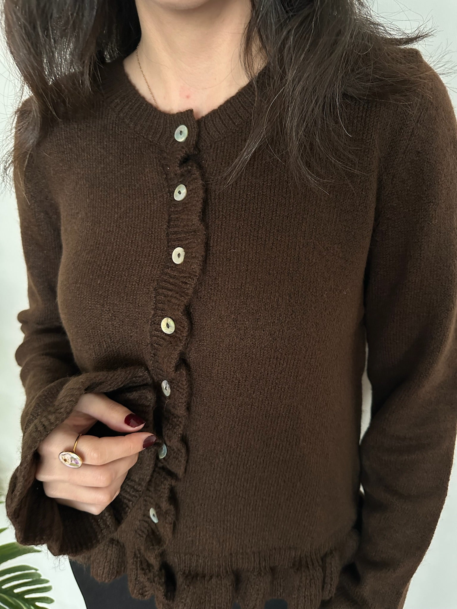 Kahverengi Fırfır Detaylı Kolu Volanlı Triko Hırka, zarif tasarımı ve yumuşak dokusuyla sezonun en feminen parçalarından biri.