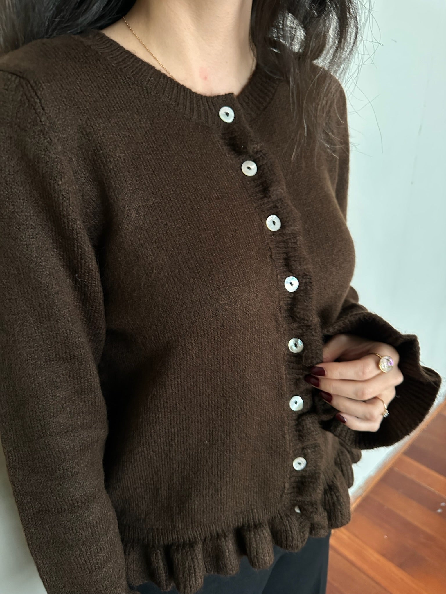Etek ucu ve kol uçlarındaki volan detaylarıyla klasik hırka formuna modern bir dokunuş kazandırır.