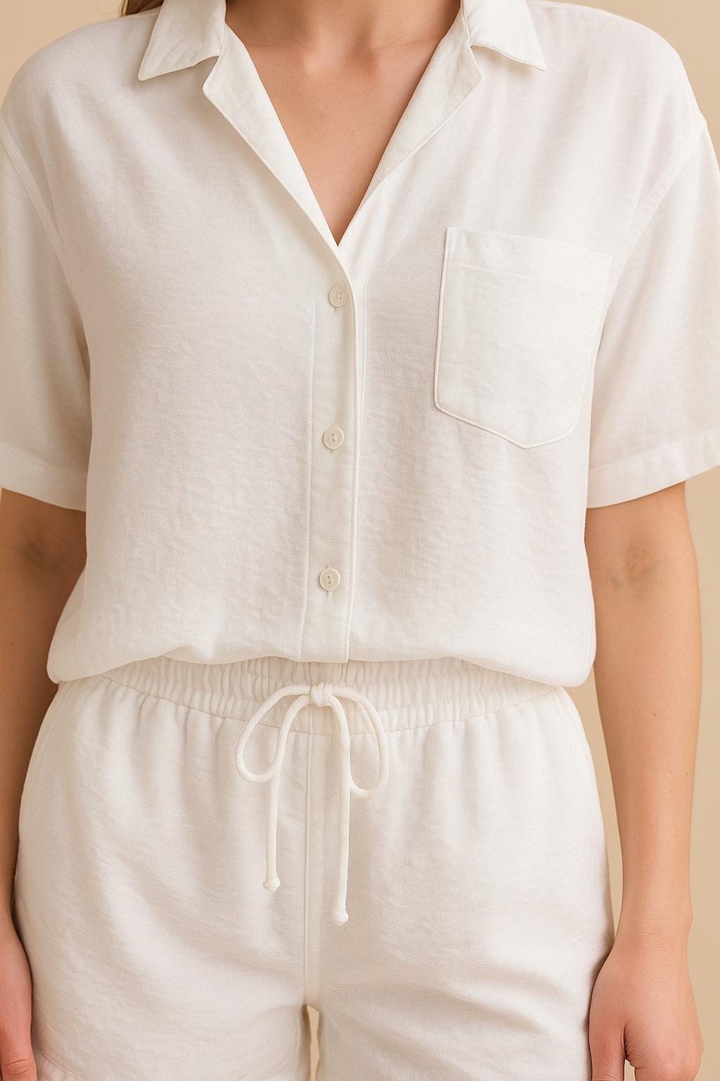 - Yazın vazgeçilmezi olmaya aday bu beyaz keten görünümlü takım, hem plajda bikini üstüne hem de şehirde günlük şıklık için idealdir.