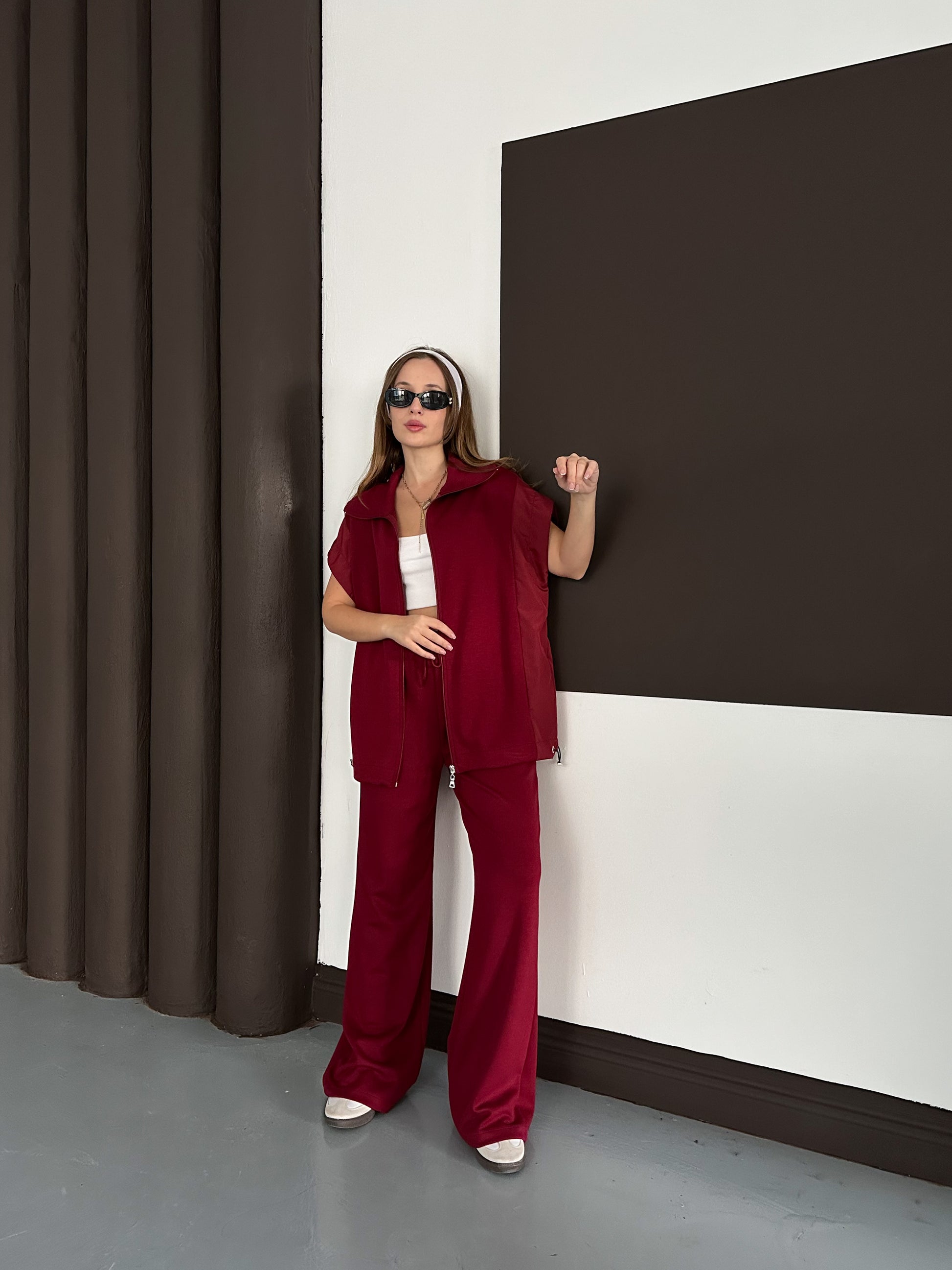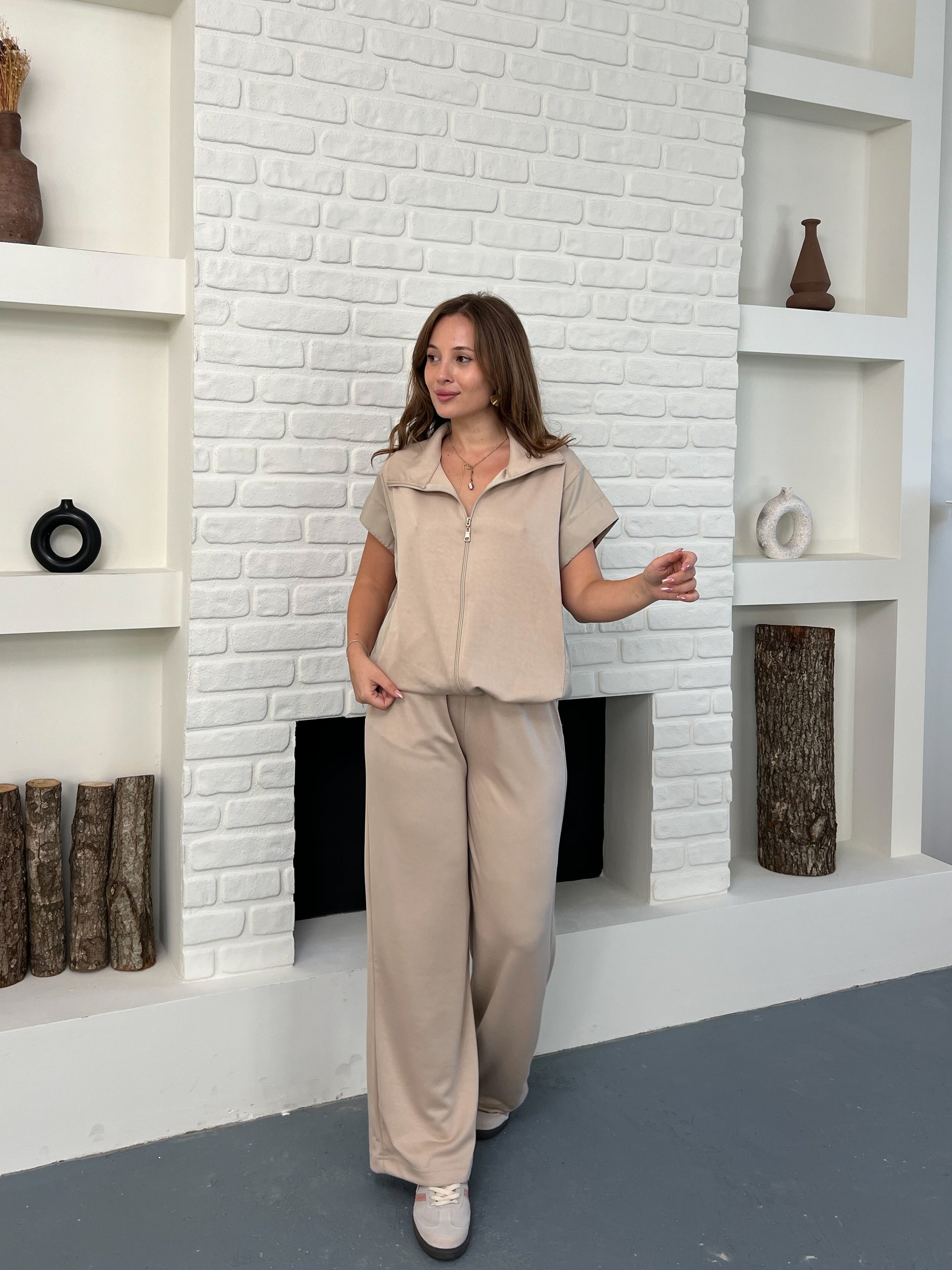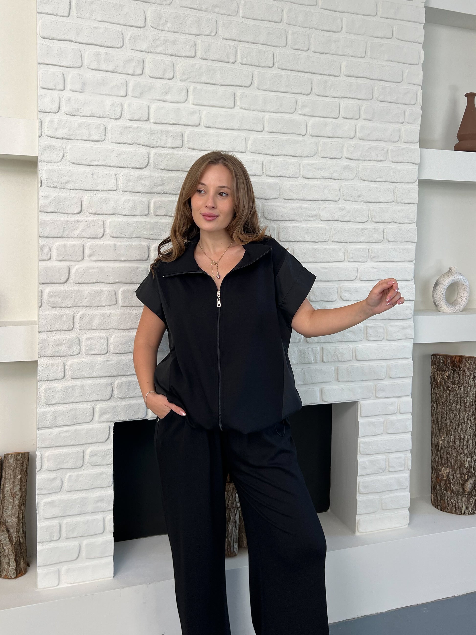 🧥 Fermuarlı kısa kollu üst, paraşüt kumaş yelek detayıyla spor-şık bir görünüm sunar.