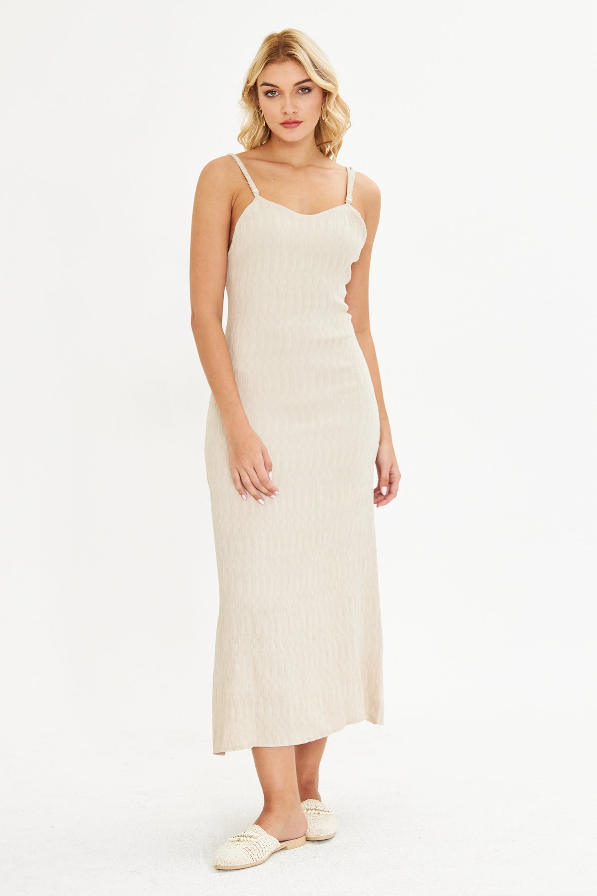 - Şıklığı ve konforu bir araya getiren ekru piliseli gömlek ince askılı elbise takımı, polyester karışımlı dokuma kumaşıyla hem zarif hem de kullanışlı bir tasarıma sahiptir.
