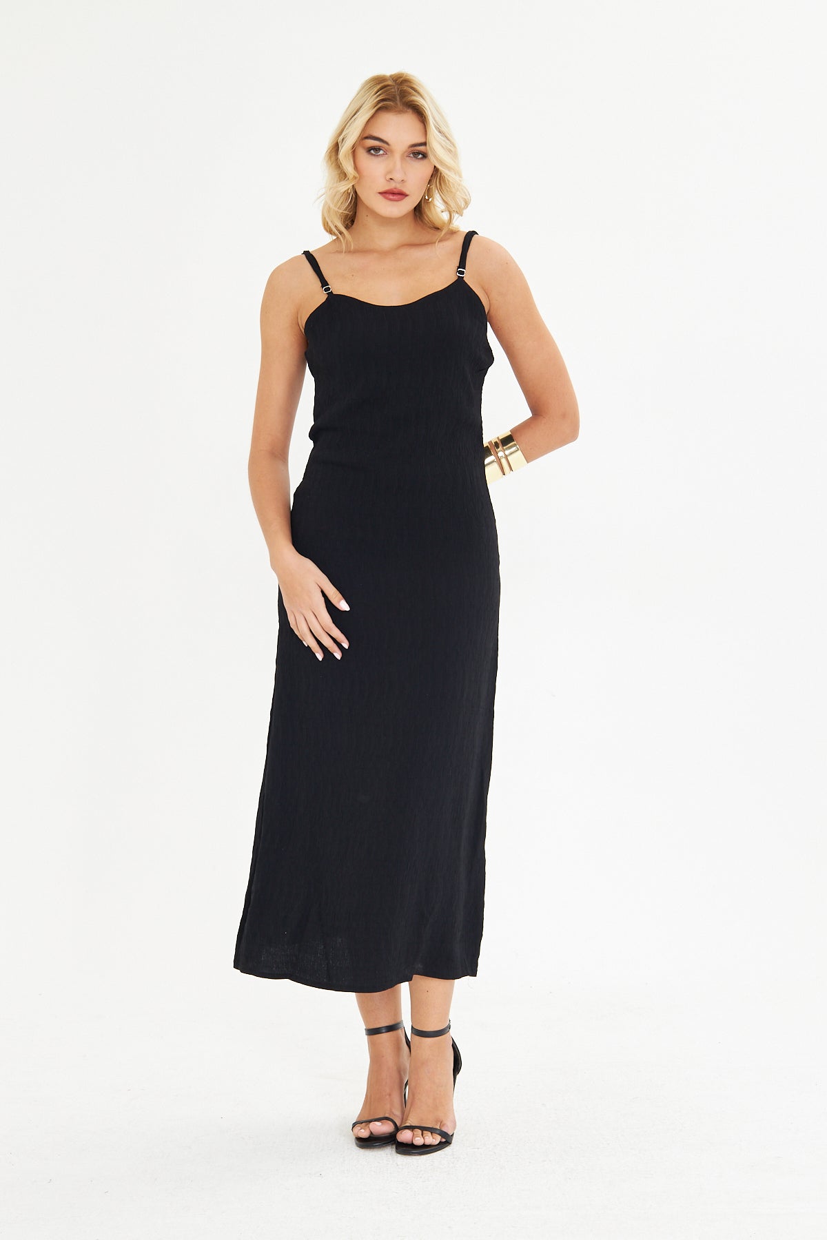 - Uzun kollu, düğmeli ve klasik yaka detayına sahip oversize gömlek, rahat bir kesim sunarken; ince askılı, kalp yaka ve uzun boy elbise feminen bir dokunuş katıyor.