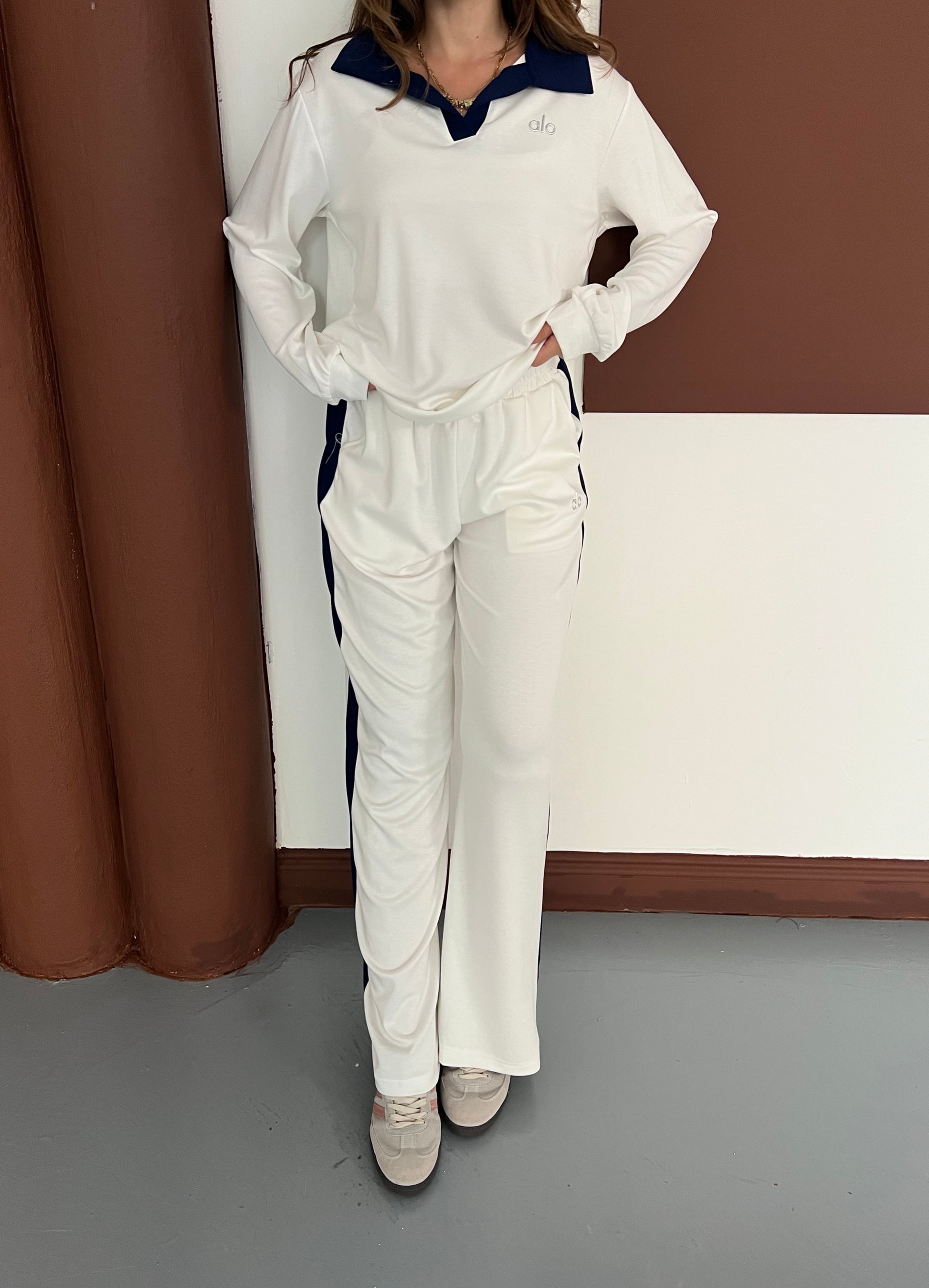 Yumuşak kumaşı sayesinde konfor sunarken, lacivert yaka ve yan şerit detaylarıyla zarif bir kontrast oluşturur. Günlük stilinde spor şıklık arayanlar için mükemmel bir tercihtir.