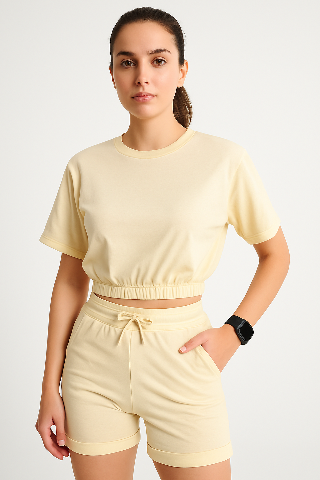 - Beli lastikli crop tişört ve şort, modern ve rahat kesimiyle gün boyu şıklık sunar.