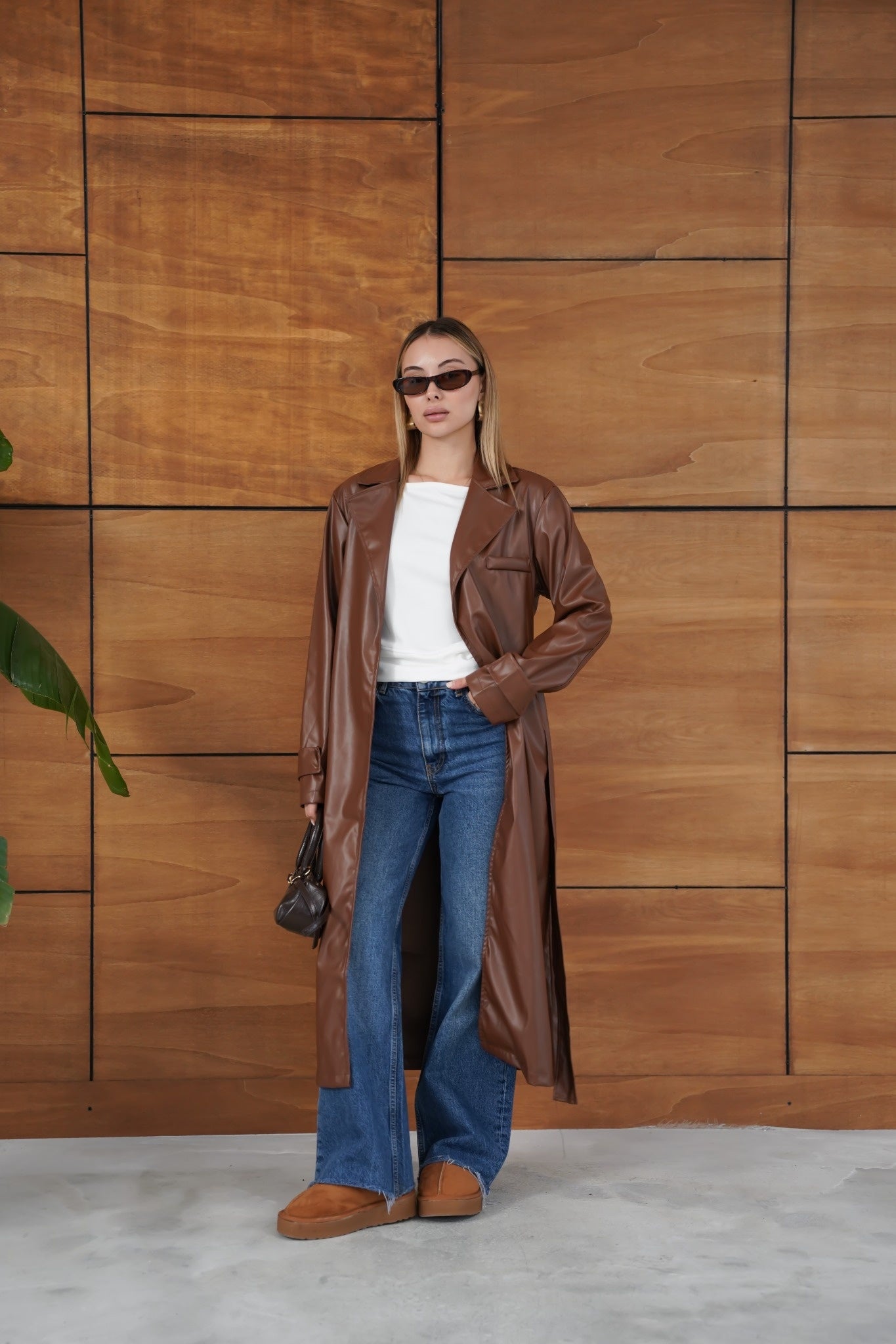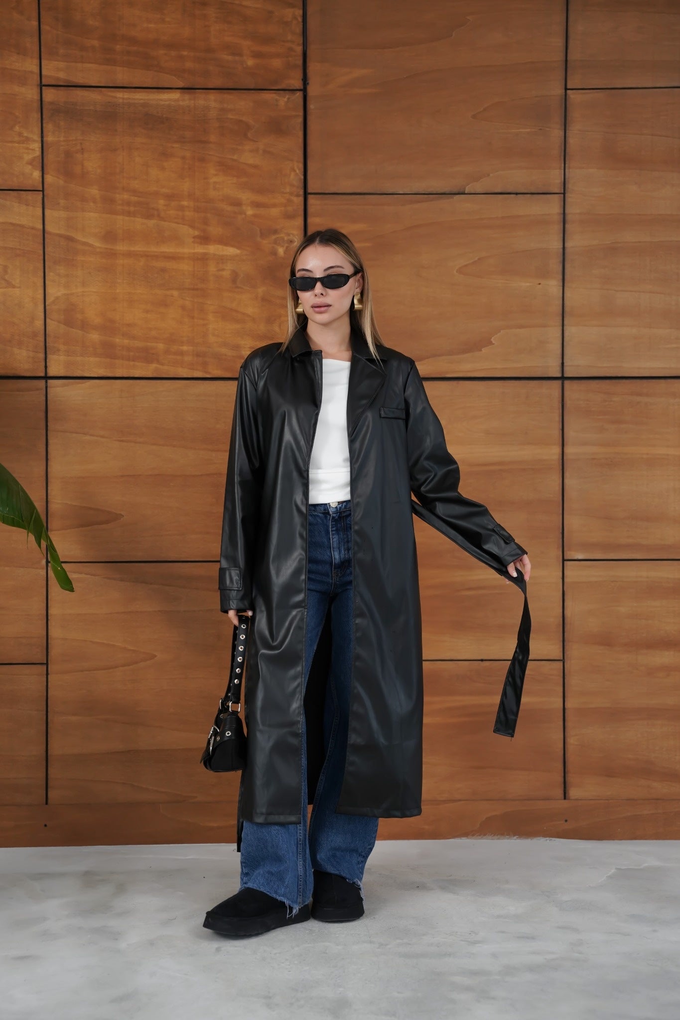 Zamansız şıklığı modern bir duruşla buluşturan Kadın Uzun Kemerli Vegan Deri Trençkot, her kombine güçlü bir stil katan vazgeçilmez bir dış giyim parçasıdır.