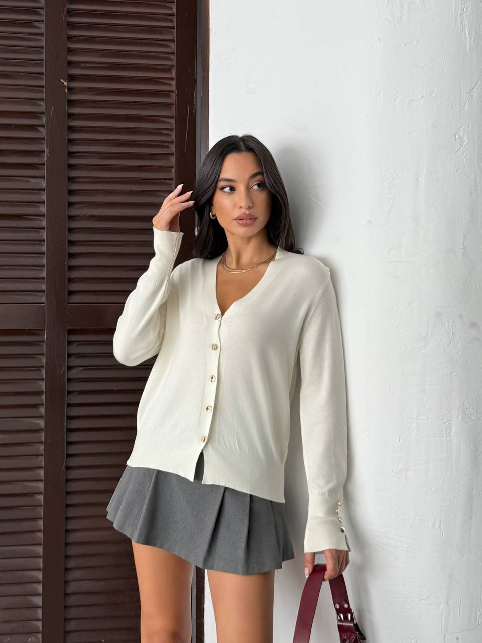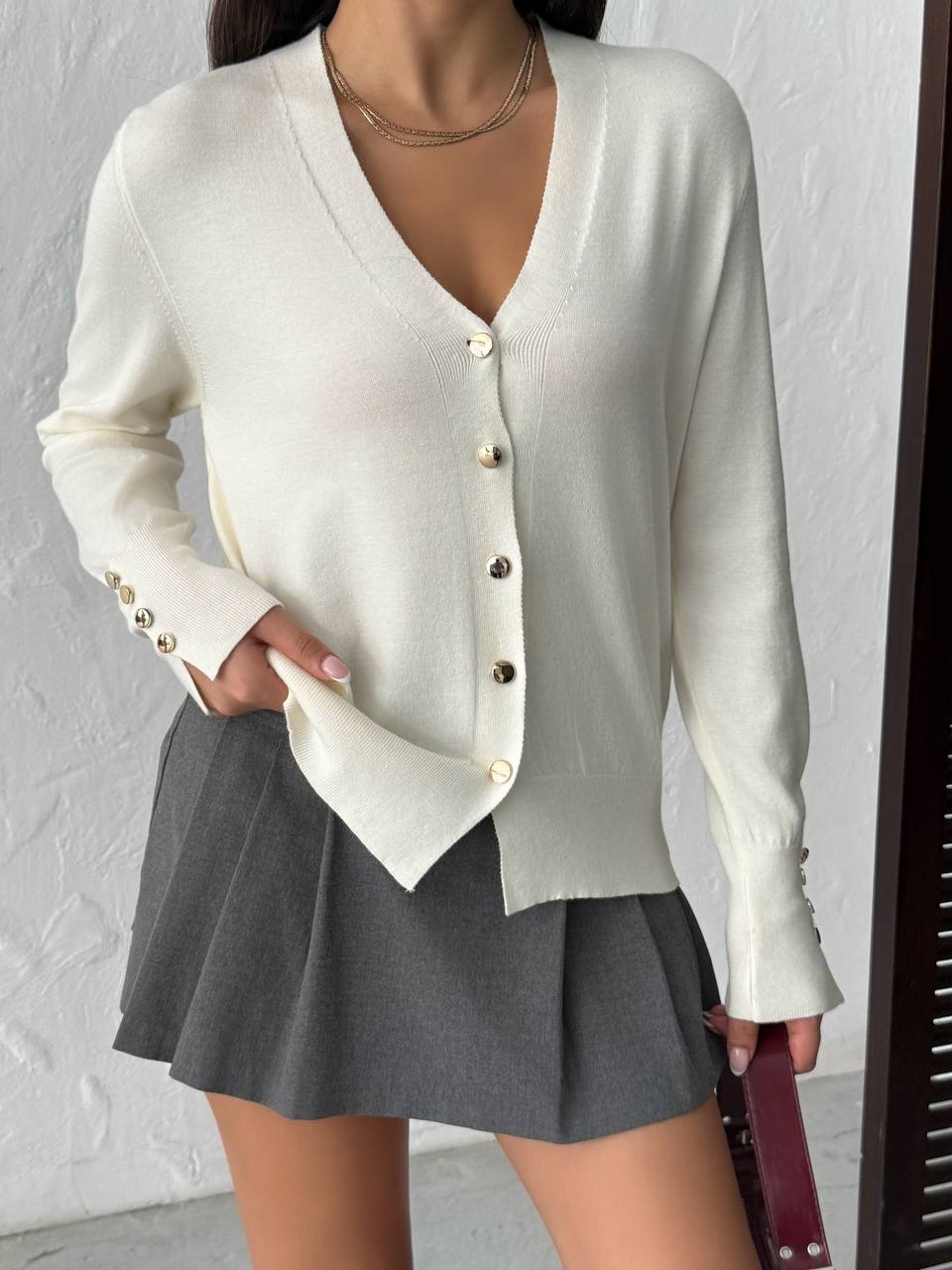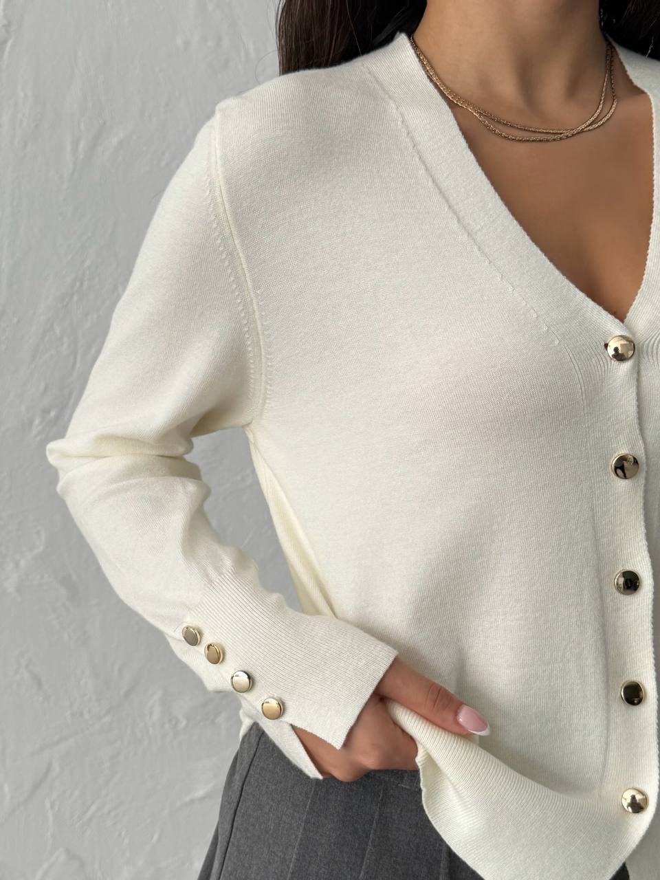 Beyaz V Yaka Altın Düğmeli Triko Hırka, sade ve zarif tasarımıyla her stile uyum sağlar. Yumuşak dokusu ve şık detayları sayesinde hem günlük kullanımda hem de özel günlerde rahatlıkla tercih edebilirsiniz.